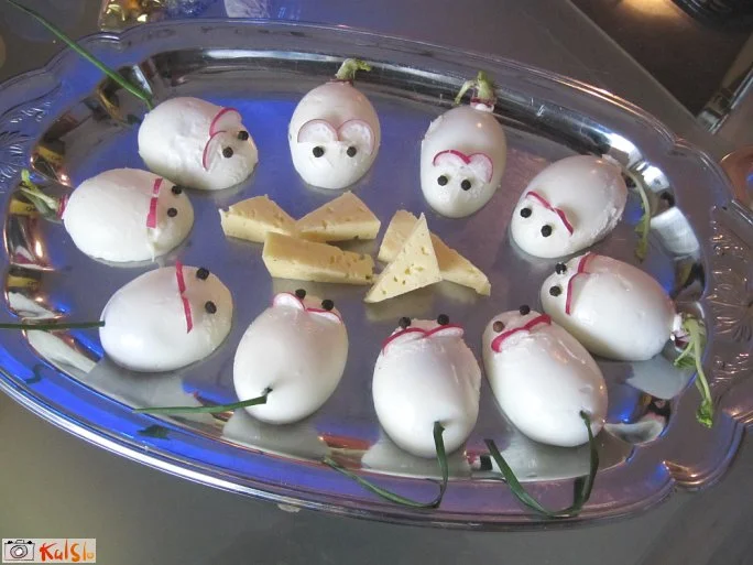 Trdo kuhana jajca po dolgem prepolovimo in postavimo na pladenj, sprednji (ožji del jajca) premažemo s kremnim sirom, nalepimo oči, za očmi pa s tankim nožem povprek malo zarežemo, da vstavimo ušesa iz tankih kolobarčkov redkvic. Za repke uporabite bodisi drobnjak, ali pa "repke", oziroma koreninice od redkvic (teh sedaj v zimskem času seveda ni).