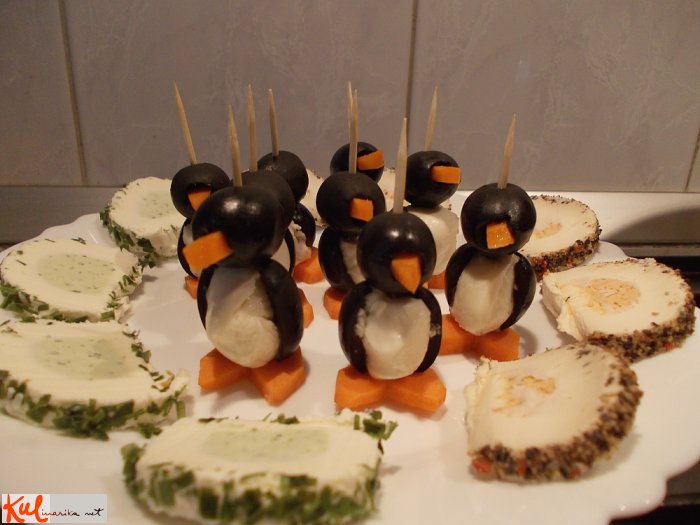 Kupimo res tiste gigantske olive (imajo jih v boljših delikatesah). Vsako na dnu malo prirežemo, da dobimo ravno dno, od vrha navzdol pa izrežemo reženj za trebušček. Praznino zapolnimo s topljenim sirčkom in s prstom poravnamo. S tem smo dobili trup pingvinćka.
