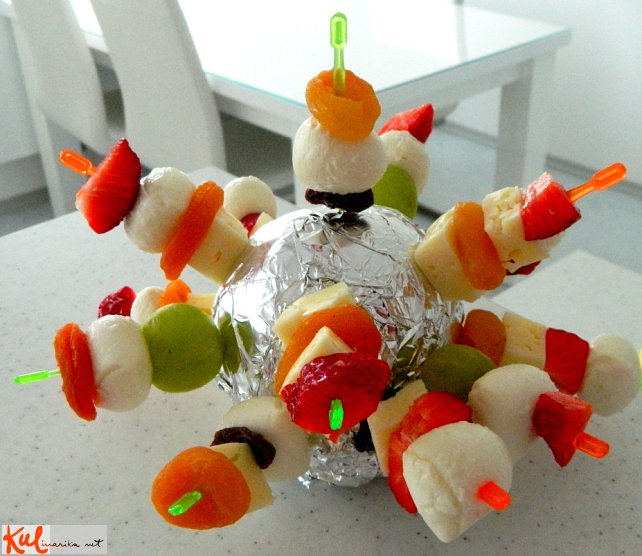 Suho in sveže sadje narežemo na manjše kose. Enako naredimo s sirom (razen, če bomo nabodalca delali z mini mozzarellami).