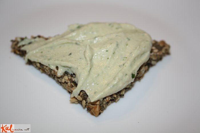 V blenderju v gladko kremo zmeljemo indijske oreščke, vodo, prehranski kvas, česen, limonin sok in sol. Na koncu dodamo nasekljan peteršilj in drobnjak.