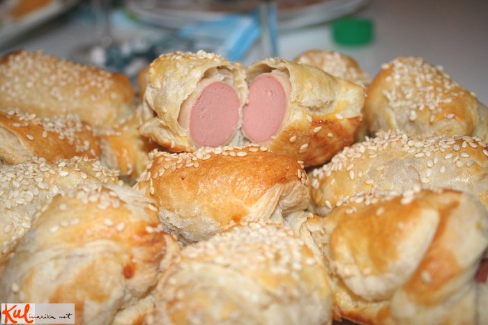 Listnato testo razvaljamo in ga razrežemo na cca. 8 cm-ske kvadratke. Sir razrežemo na palčke (kot pommes frites). V hrenovke (surove) naredimo vdolbino- zarezo, v katero vložimo sirove palčke. Tako napolnjene hrenovke položimo diagonalno na listnato testo, nato pa testo povlečemo čez hrenovko in vogalčka testa stisnemo, da se sprimeta. Testo po površini premažemo s stepenim jajcem. Pečemo v
