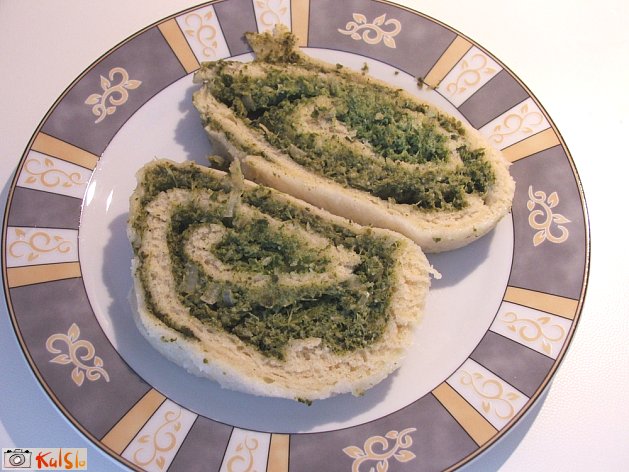 štruklji iz kvašenega testa s špinačno skutnim nadevom, kuhani v prtiču
