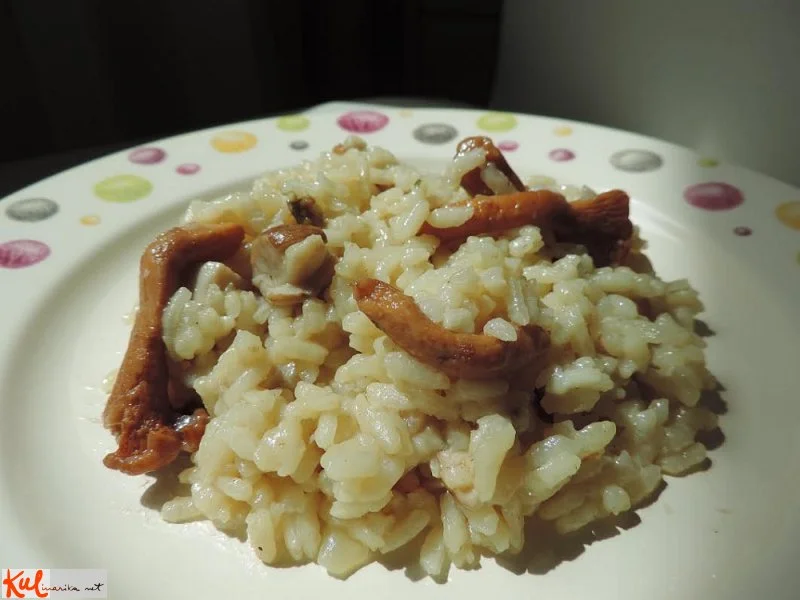 Dodamo oplaknjene gobice ter jih dušimo, dokler se ne odtalijo. Solimo, popramo ter dodamo oplaknjen riž, dušimo še kakšno minutko, nato dodamo tri zajemalke jušne osnove. Dušimo še nekaj minut, nato dodamo preostalo jušno osnovo. Dušimo še približno 15 minut, nato pokrijemo posodo za 10 minut. Ponudimo s po želji naribanim parmezanom ali Grana Padano.