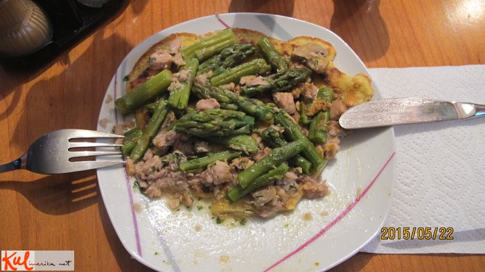 Palačinki spečemo iz že znanih sestavin, s to razliko, da v maso dodamo bezgove cvetove, brez debelejših pecljev. Palačinki nadevamo s tuno, narezanimi šampinjoni in rahlo prekuhanimi šparglji. Začimbe dodamo po okusu.