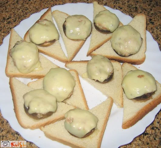 Klobučke napolnimo z nadevom in pokrijemo z rezino sira. Klobuček nato položimo na polovico toasta in ga v pečici na žaru zapečemo, da se sir raztopi.