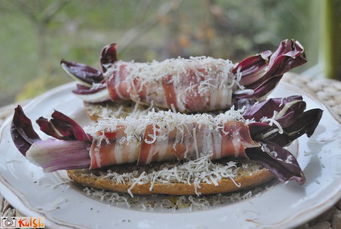 V posodico, z nekaj žličkami oljčnega olja, stisnemo 1 strok česna, premešamo ter pustimo stati nekaj minut. Z odišavljenim oljem premažemo vsak kos kruha in ga natremo s provansalskimi začimbami. Oprane liste radiča (4 kose) zložimo drug ob drugega in v sredino položimo za palec velik kos Brie-ja. Vse skupaj ovijemo z rezino pancete in položimo na začinjen kos kruha. Ponovno rahlo potresemo z začimbami in po vrhu naribamo parmezan. Kruhke položimo na peki papir, ki ga poškropimo z vodo, da preprečimo izsušitev. Pečemo 12-15 minut na 180 stopinj.