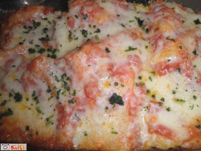 Pekač naoljimo in vanj stresemo polovico paradižnikove omake, koščke polente razporedimo ter jih prelijemo s preostankom omake. Potresemo sir in pečemo približno 20 minut.