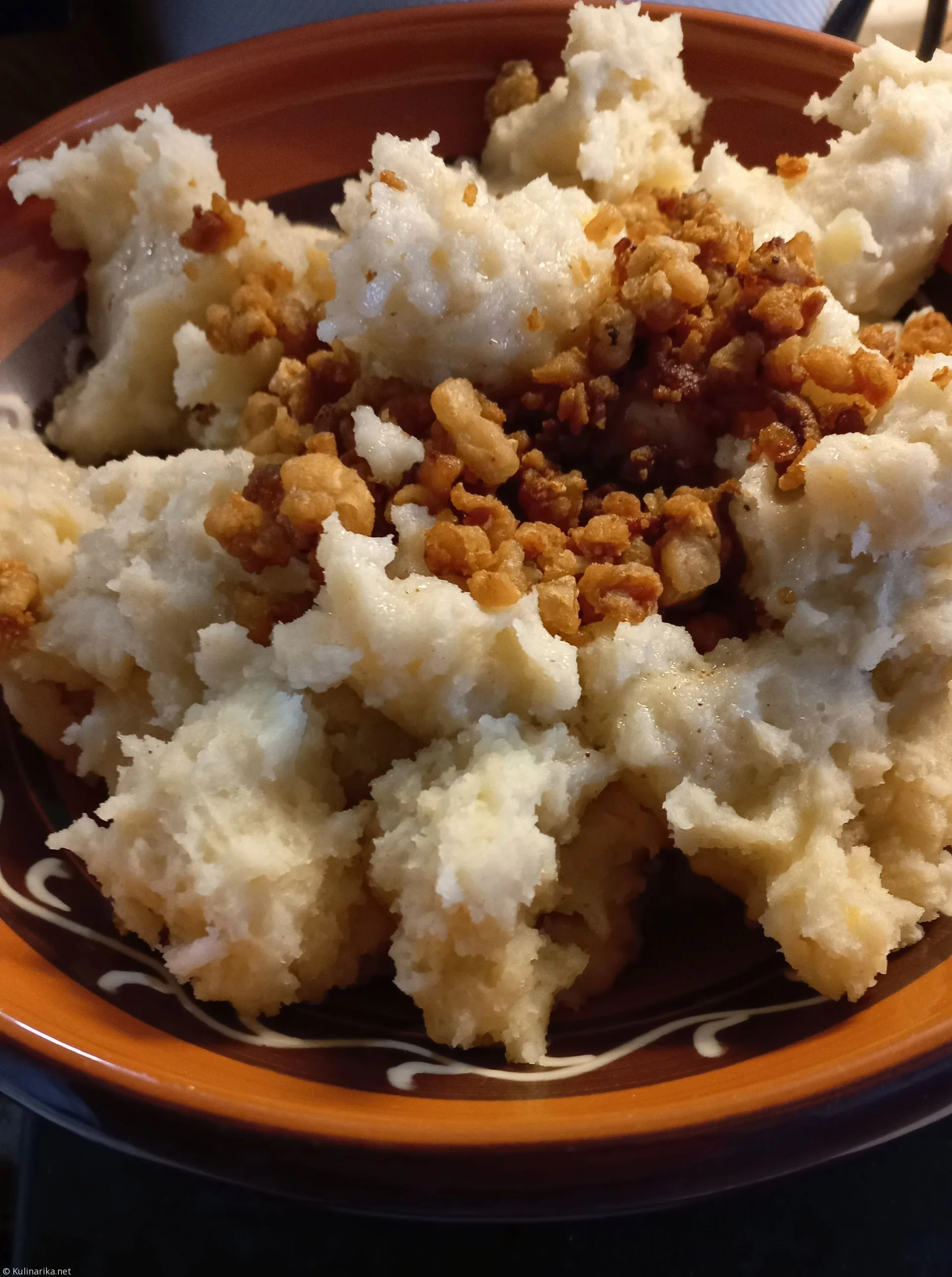 Razbelimo ocvirke in jih prelijemo preko žgancev.