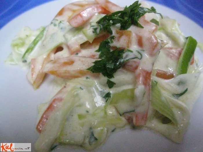 Korenček prerežemo na pol ali na tri dele in jih narežemo na palčke. Por prerežemo po dolgem in narežemo na isto velike kose kot korenje. Peteršilj nasekljamo.