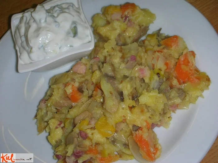 Zelo dober recept, vendar sem ga še malo izpopolnil. Vse sem naredil kot imaš opisano v receptu, vendar sem vse skupaj pekel počasi na 160 stopinj. Pred tem kot sem dal v pečico sem na rezine narezal topljeni sir in ga razporedil in žlico masti ter začinil z žlico drobnjaka. Ko se je mast in sir razpustila sem še malo premešal in prelil z dvema stepenima jajčkama. Po približno 45 minutah je vse skupaj lepo zapečeno.