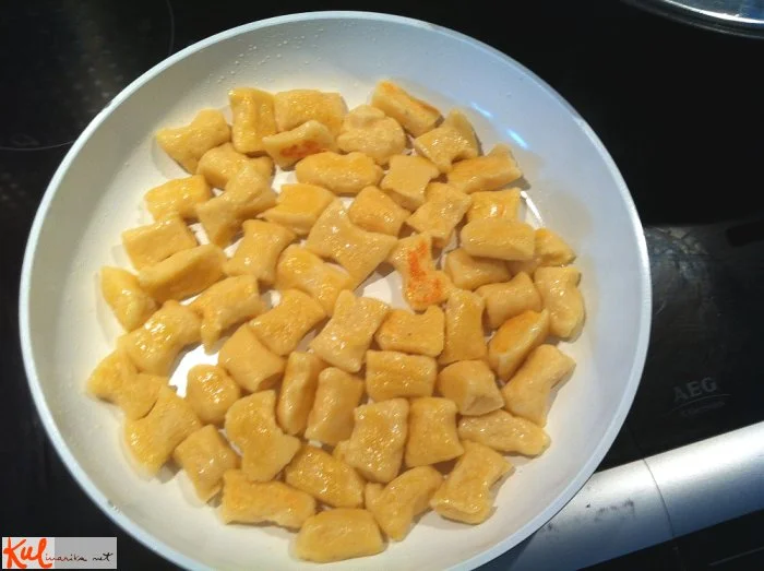 2. Zavremo soljeno vodo, damo vanjo njoke in jih kuhamo, dokler ne priplavajo na površino. S penovko jih poberemo ven in jih popečemo na maslu kot prilogo ali ponudimo s poljubno omako kot samostojno jed.