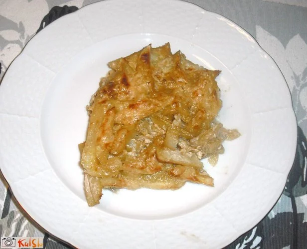 V pomaščen pekač damo najprej krompir, nato sardelice s čebulo, zgornja plast naj bo krompir. Polijemo z 1,5 dl smetane in damo v prej segreto pečico na 225 stopinj. Pečemo približno 30 minut.