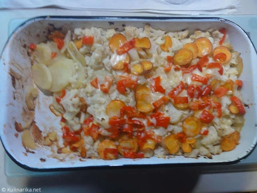 Pekač namažemo z oljem, zložimo na lističe narezan krompir (zato naj se krompir preveč ne razkuha, saj bomo med rezanjem dobili packarijo), podrobimo po celem cvetačo, potresemo s poprom (po okusu, da vas potem ne bo žgalo), dodamo na kolobarje narezan korenček, narezano papriko (predhodno očiščeno), posujemo peteršilj, na kockice narezano slanino in zalijemo s sladko smetano. Pokrijemo in položimo v na 200 stopinj ogreto pečico. Pokrito pečemo cca. 20 minut, zatem delno odstranimo folijo, tako pečemo 10 minut, nazadnje odkrijemo in odkrito pečemo še cca. 10 - 15 minut. Biti mora lepo zapečeno, ne pa zažgano.