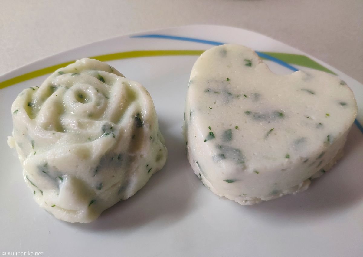 V soljeno hladno vodo stresemo polento in ob segrevanju do vretja ves čas mešamo z metlico za stepanje. Kuhamo približno 2 minuti, nato vmešamo maslo, da se stopi. Vmešamo še kislo smetano in nasekljan čemaž in takoj odstavimo. Postrežemo kot prilogo k mesu v omaki.