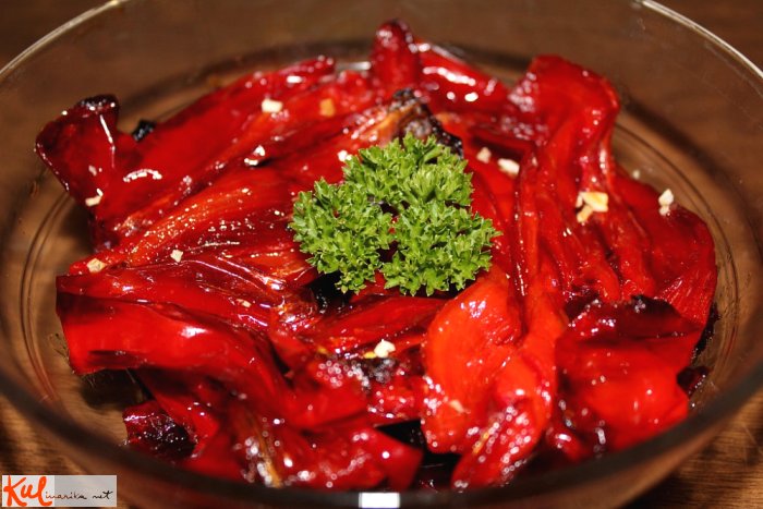 Pečene paprike prestavimo v stekleno posodo in ko se nekoliko ohladijo, po želji dodamo peteršilj**. Pokrijemo.