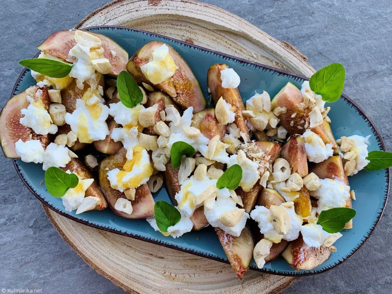 Ohlajene fige narežemo na četrtine in jih predenemo na krožnik. Dodamo svež sirček, med, svežo meto in nasekljane indijske oreščke (ali maslo indijskih oreščkov). Postrežemo.
