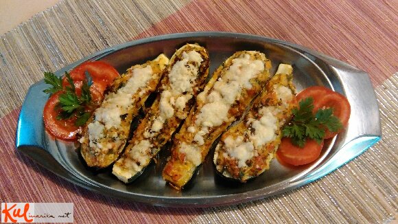 Bučko umijemo in prepolovimo po dolžini ter jo izdolbemo (najlažje z žličko). Izdolbene ostanke bučke damo v skledo (lahko vse, lahko polovico – po okusu), dodamo nasekljan paradižnik in nasekljano papriko ter naribamo krompir (kot jabolka za jabolčni zavitek). Naribamo še korenček (na najbolj drobno) ter stisnemo strok česna in dodamo na čebuli prepraženo slanino ter začimbe. Na koncu dodamo še surovo jajce in vse skupaj premešamo.