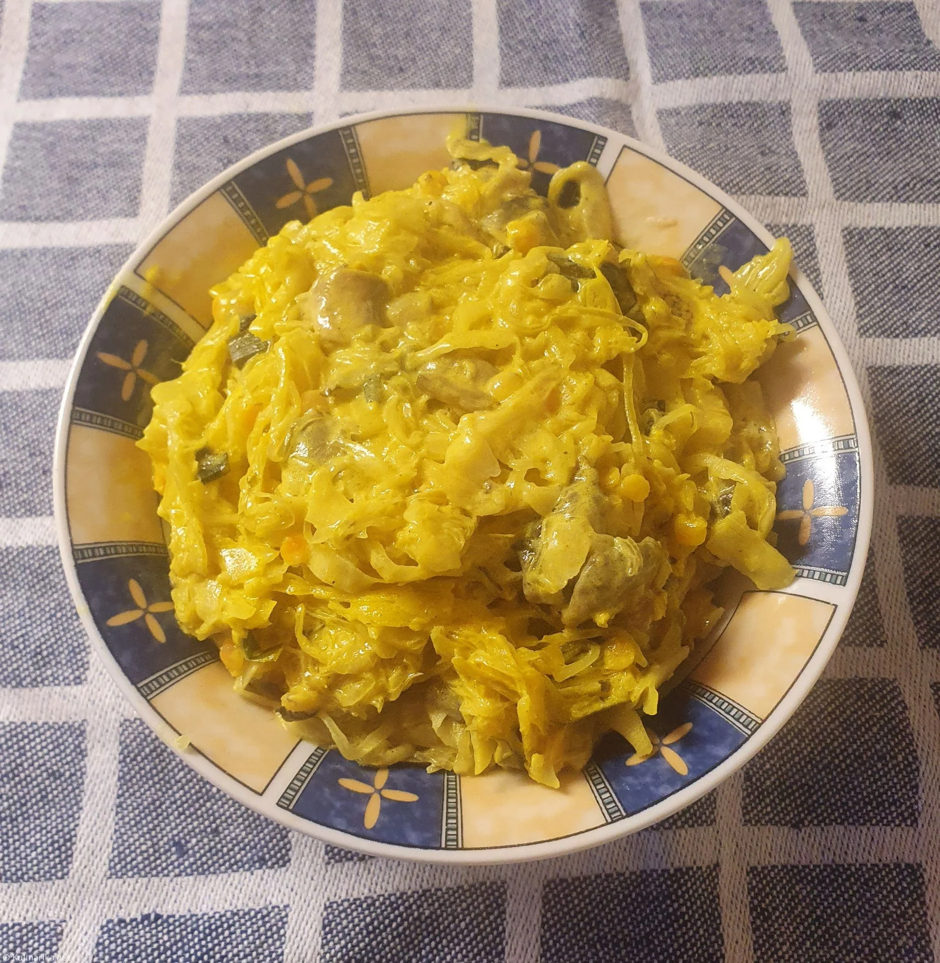 Na ponvi segrejemo olivno olje in na njem najprej prepražimo por in kislo zelje.