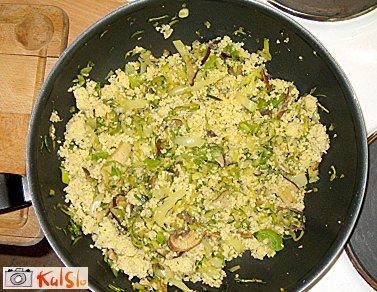 Na malo maščobe popražimo narezan por, dodamo narezano papriko, gobe in naribano bučko. Rahlo prepražimo, dodamo strt česen, solimo, popramo in dodamo kuhan kus-kus ter potresemo s sesekljanim peteršiljem. Premešamo in postrežemo.