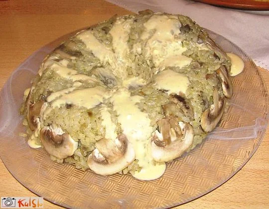 Gotov rižev venec zvrnemo iz modela ter prelijemo s sirovo omako.