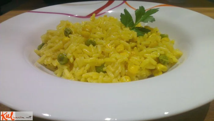 Čebulo ali šalotko sesekljamo na zelo majne koščke in jo malenkost popražimo na olju ali maslu. Dodamo zelenjavo in na majhnem ognju pražimo cca. 5 minut, dodamo riž in pražimo še nadaljnjih 5 minut. Dodamo sol, poper in manjšo žličko kurkume (po okusu). Vse skupaj zalijemo z dvojno količino vode kolikor je bilo riža. Premešamo, pokrijemo posodo in na najmanjšem ognju dušimo dvajset minut oz. toliko, da je riž mehek.