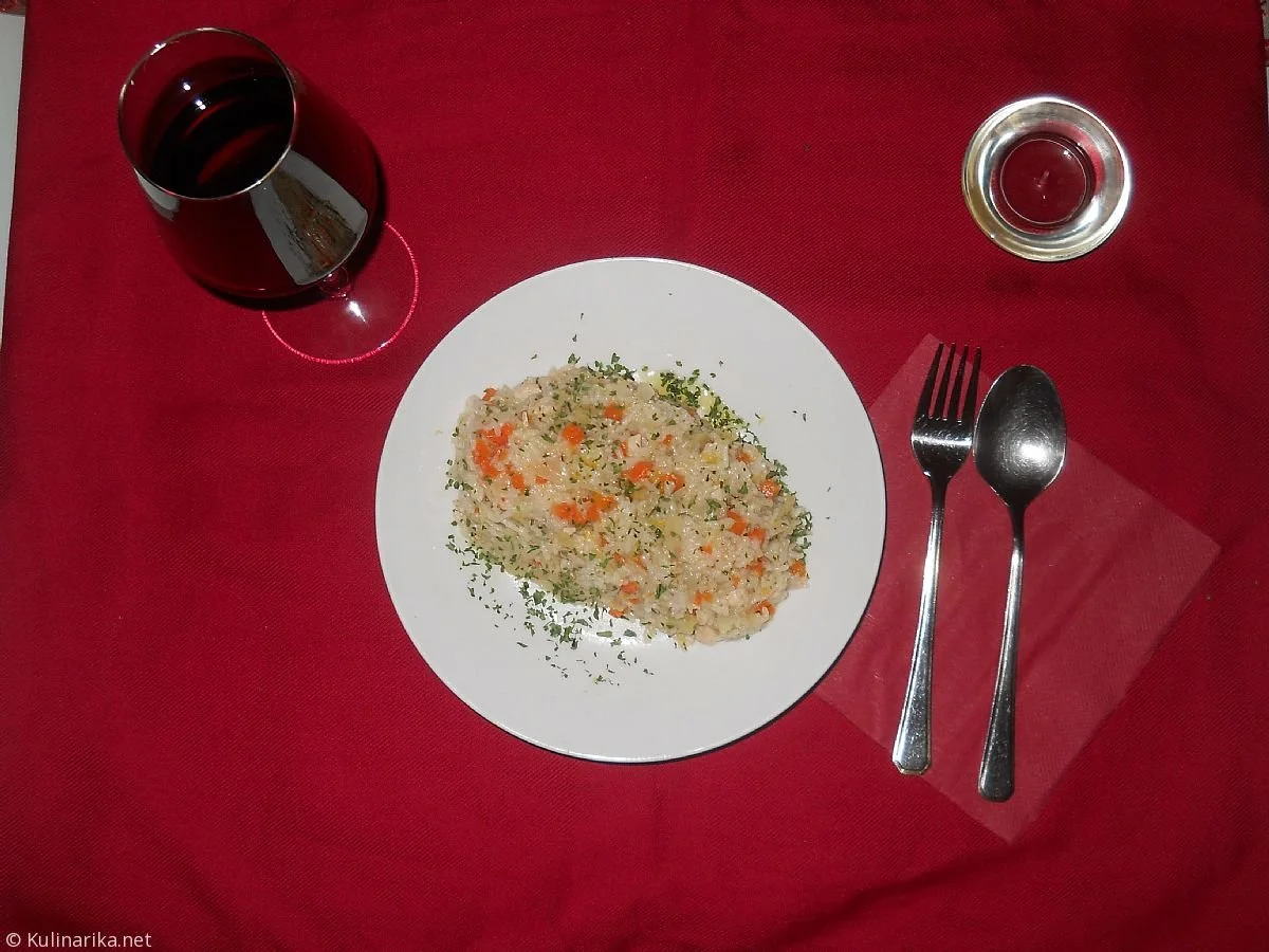 3. Rižoto kuhamo toliko časa, dokler voda ne izpari oziroma dokler riž ni dovolj kuhan. Na koncu kuhanja jed začinimo po svojem okusu in vse skupaj dobro premešamo.