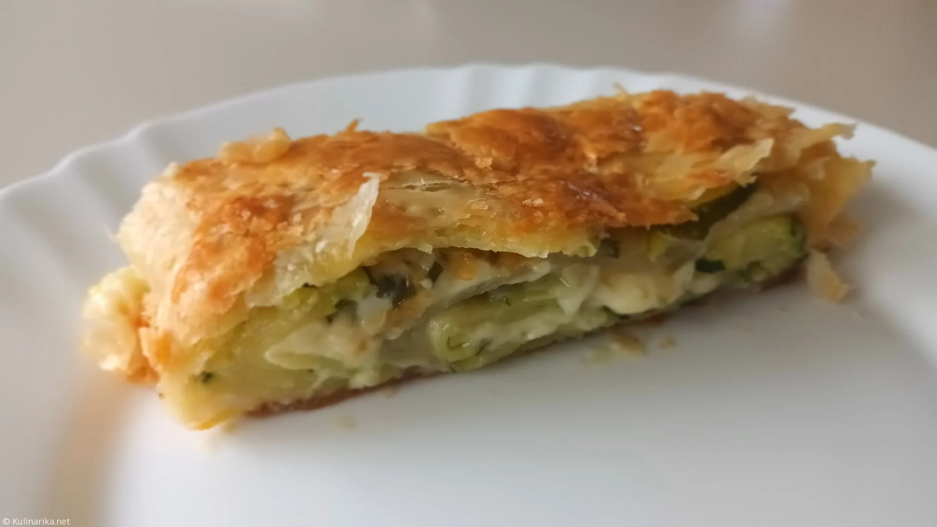 Na listnato testo potresemo drobtine in enakomerno naložimo bučke do 3/4 testa. Nato potresemo še nariban sir in drobnjak.