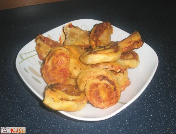 razvaljamo listnato testo in ga namažemo s kečapom po celem. Potresemo z origanom in potresemo po celi površini z naribano šunko in sirom (kot pri pici). Zvijemo v rolado in narežemo na kolobarje. Položimo na peki papir in pečemo na 180 - 200 stopinjah pol ure!