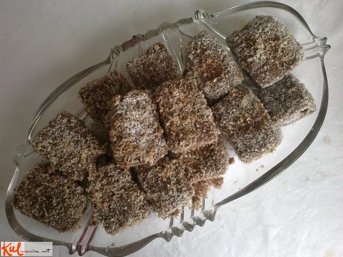 V električnem mešalniku vmešamo jajca. Po žlicah dodajamo sladkor. V manjši skledi zmešamo moko in pecilni prašek. Moko s pecilnim praškom dodamo jajčni masi. Dodamo še mleko in olje. Vse skupaj mešamo, dokler ne dobimo gladke mase. Pečemo 40 minut na 170 stopinjah. Biskvit pustimo, da se ohladi (približno 30 minut). Medtem narežemo čokolado na manjše kocke. V kozici razpustimo maslo, mleko, sladkor, čokolado in rum. Vse skupaj zmešamo in počakamo, da se ohladi. Biskvit razrežemo in vsako kocko posebej pomočimo v čokolado in povaljamo v kokosu.