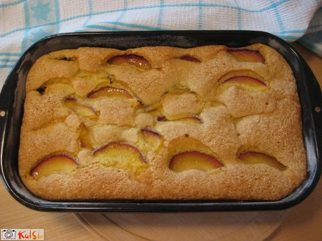 Postopoma dodajamo moko in pecilni prašek. Vse dobro premešamo in vlijemo v pekač namazan z maslom ali margarino, potresemo žlico moke, ki jo potresemo po celem pekaču in vanj vlijemo zmes. Po vrhu zmesi narahlo polagamo koščke breskev, eno zraven druge tako, da prekrijemo površino. Lahko jih položimo v vzorček v kroge...
