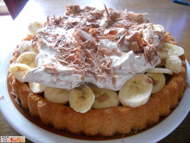 Za deset minut pustimo, da se strdi. Nato narežemo banano na tanke kose in obložimo pito. Dodamo še sladko smetano, na koncu nastrgamo malo čokolade in posujemo.
