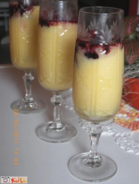 Sladko smetano stepemo ter dodamo po žlicah k nekoliko ohlajeni jajčni kremi. Precedimo skozi cedilo v kozarce (lepo pride v kozarcih za šampanjec). Ko se ohladi, dodamo sadje, premešano z medom. Postavimo v hladilnik.