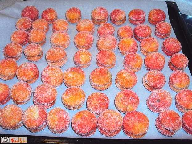 Sestavine za testo (vse razen 1 kg moke) dobro premešamo s kuhalnico. Masa naj počiva v hladilniku vsaj 2 uri. Po dveh urah primešamo 1 kg moke. Oblikujemo kroglice v velikosti večje frnikule in pečemo 12 minut pri 180 stopinjah. Še vroče piškote - polkrogle izdolbemo.