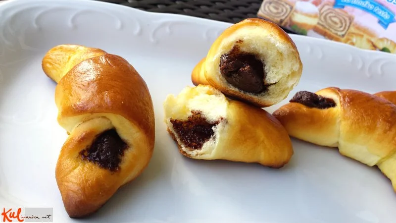 Vzhajano testo pregnetemo, razdelimo na šest kosov in pustimo počivati nekaj minut. Nato vsakega na tanko razvaljamo v obliko kroga. Krog razrežemo na osem trikotnikov in na zunanji del vsakega trikotnika položimo žličko čokoladnega nadeva. Trikotnik začnemo zvijati v rogljiček na zunanjem delu (pri nadevu) proti notranjosti (špici trikotnika) in oblikujemo rogljiček. Postopek ponovimo še pri ostalih krogih.