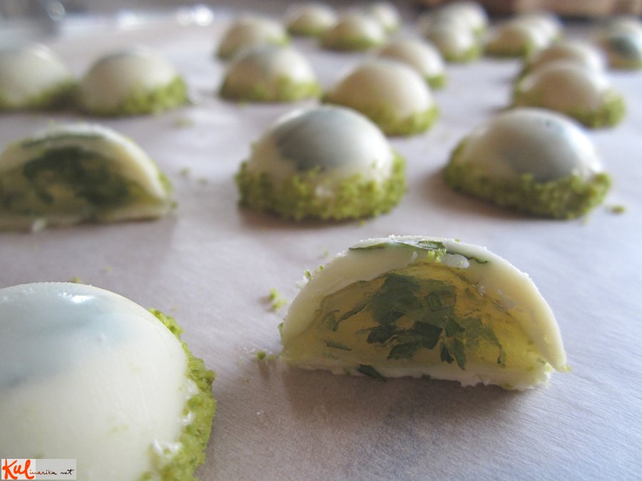 3. Med tem, ko se čokolada trdi, naredimo nadev. V 1 deciliter likerja damo agar agar in ob stalnem mešanju zavremo ter pustimo, da vre slabo minutko. Odmaknemo in prilijemo še ostali liker. Nekaj lističev mete sesekljamo ter jih damo v modelček. Ko se začne liker že malo gostiti, ga prelijemo v malo dresirno vrečko, spodaj malo odrežemo in napolnimo modelčke, toda ne prav do vrha. Na že trd nadev nabrizgamo še "pokrov" in s tem zapremo čokolatin.