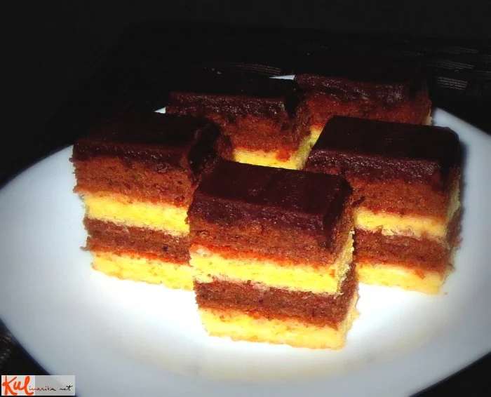 Pečen biskvit prerežemo na polovico - oba (svetlega in temnega). Nato položimo svetel biskvit, katerega premažemo z marmelado, nanj damo temen biskvit in ga premažemo z marmelado in to še enkrat ponovimo. Ta biskvit obtežimo, da se strdi, na koncu pa vse prelijemo s čokoladnim prelivom ali pa kakšnim drugim prelivom, recimo limoninim, skratka po želji. Obtežitev naj bo najmanj 10 kg.