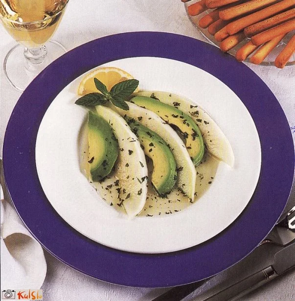 Krhlje melone in avokada menjaje zložimo na pladenj. V ohlajen preliv zmešamo sesekljano meto in z njim prelijemo solato. Okrasimo z vejico mete.