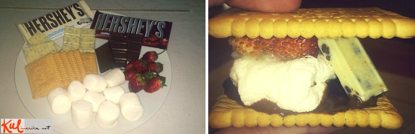 Čokoladno tablico Hershey´s Milk nadrobimo na koščke in stopimo v mikrovalovki, nato jo polijemo po hrbtni strani polovice piškotov. Marshmellow položimo na krožnik, do polovice stopimo v mikrovalovki, tako da postanejo mehki. Takoj jih položimo na vrh piškota, oblitega s čokolado, nanj pa položimo jagode in nestopljene koščke Hershey´s Cookies n˙Cream čokolade. Pokrijemo s piškotom in še tople pojemo.