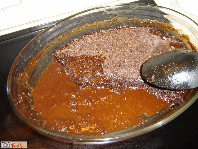 4. Za omako zavremo vodo in medtem zmešamo sladkor in kakav. Ko voda zavre, jo postopoma prilivamo k mešanici sladkorja in kakava, ter dobro premešamo. S tem prelijemo še surovo maso za narastek.