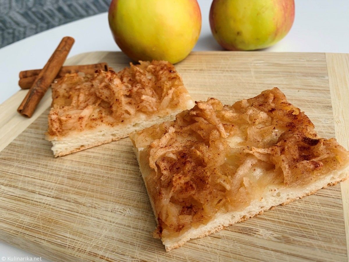 Olupimo in naribamo jabolka ter jih naložimo na testo. Celotno površino posujemo še z eritritolom in cimetom. Pečemo 30 minut na 200 °C.