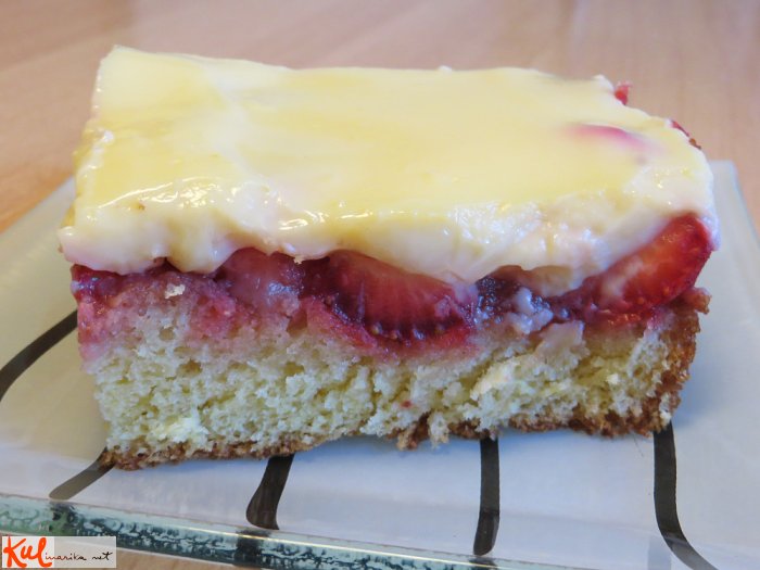 Ko je pečeno, pecivo namažemo z marmelado in na to naložimo oprane, razpolovljene jagode.