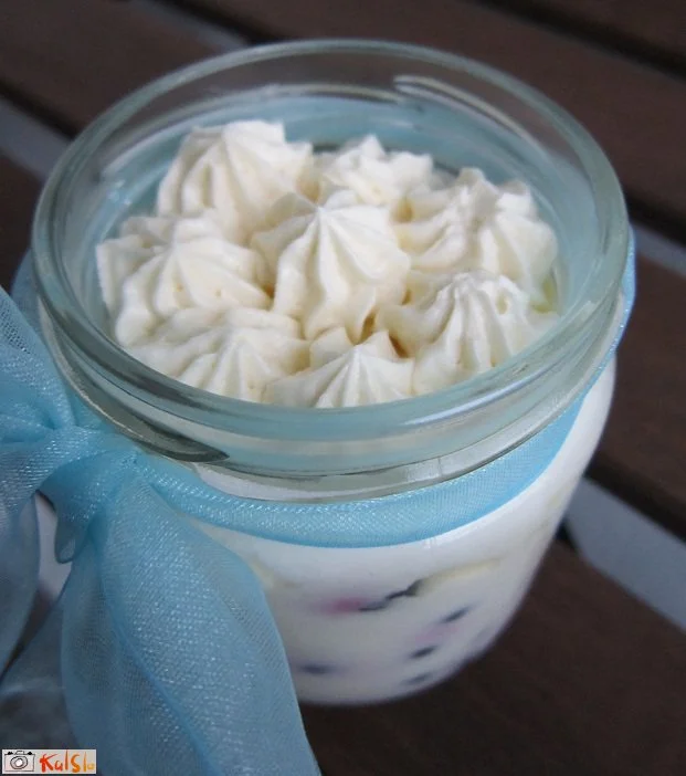 Tokrat sem ga delala z zmrznjenimi borovnicami, na vrhu pa nisem potresla bele čokolade ampak nabrizgala tole izvrstno kremo http://www.kulinarika.net/recepti/17224/sladice/maslena (dodala sem ji večji delež smetane, tako da je bila bolj redka, a še vedno dovolj kompaktna).