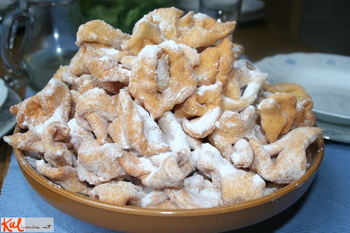 Jaz pa razvaljam testo kolikor se da na tanko, potem pa še vsak odrezan košček v rokah fino raztegnem v vse smeri in prepletem, predno ga dam v olje. Pridejo tako krhki, da jih je težko prijeti z roko, da se ne polomijo. V ustih pa se kar topijo. To so pravi flancati ![]()