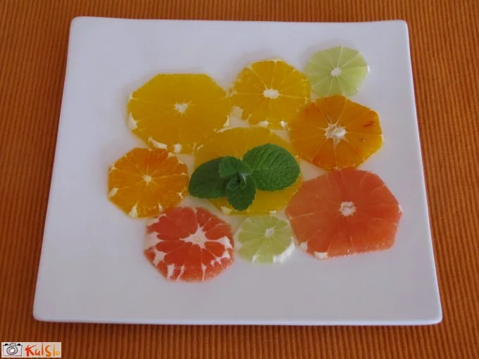 Citruse z ostrim nožem olupimo in narežemo na tanke rezine. Razporedimo jih po krožniku in pokapamo z nekaj kapljicami rožmarinovega sirupa.