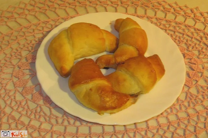 Najprej naredimo vzhajanec iz kvasa, 3 žlice mleka in ščepca sladkorja. Pripravimo moko, naredimo luknjo in po robu razdelimo sol. Prekrijemo jo z moko. V sredino damo vzhajanec, rahlo premešamo in dodamo preostale sestavine. Zamesimo v mehko, rahlo in gladko testo. Pustimo vzhajati ½ ure. Potem maso razdelimo na 5 delov. Vsak del razvaljamo v krog in krog razrežemo na 12 koncev. 1 cm od roba (široki del) nanesemo poljuben nadev (Nutela, orehi, marmelada) in zvijemo proti kratkemu delu. Prva dva zavihka močneje pritisnemo, da nadev ne steče ven. Pečemo 20 – 30 pri 200 stopinjah.
