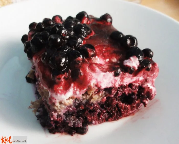 Zmes premažemo čez ohlajen biskvit in čez potresemo borovnice. Pustimo stati v hladilniku okoli 2 uri, najbolje čez noč.