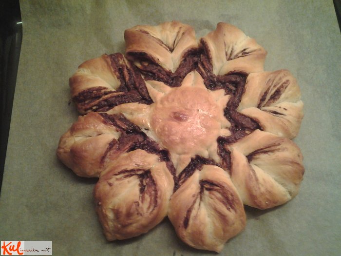 V moko naredimo jamico. V jamico zdrobimo kvas, dodamo malo sladkorja in zalijemo z mlačnim mlekom. Lahko vmešamo žlico moke, da kvasni nastavek prej vzhaja. Pustimo na toplem da vzide. Medtem segrejemo preostalo mleko, ga odstavimo, dodamo maslo, rumenjake, pomarančno lupino in rum ter zmešamo, da se rumenjaki lepo vmešajo. Počasi vlijemo h moki, dodamo sol in zamesimo testo, ki naj vzhaja 30 minut. Ko testo vzide, ga razdelimo na 4 enake dele, ki jih na tanko razvaljamo in obrežemo v krog. Pomagamo si lahko s servirnim krožnikom. Ko imamo štiri enake kroge, prvega položimo na pekač obložen s peki papirjem in ga namažemo z Nutello (namažemo 1 centimeter od roba). Na vrh položimo drugo plast testa in ponovimo. Ko položimo na vrh zadnjo plast testa, položimo na sredino kozarec in z nožem krog razdelimo na šestnajstine. Primemo po dva traka in ju dvakrat zavrtimo navznoter ter konca stisnemo skupaj. Na koncu zvezdo premažemo z beljakom in jo damo v pečico na 180 stopinj za cca. 25 minut. Vsak pa najbolje pozna svojo pečico in ve za natančnejše nastavitve.