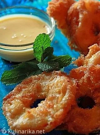 1. Pripravimo gosto žvrkljano testo in sicer tako, da posebej razžvrkljamo polovico sladkorja, 2 rumenjaka, sol in polovico moke. Nato dodamo stepen sneg, v katerega smo vtepli preostali sladkor in dodamo še preostalo moko. Olupljena jabolka zrežemo na 1 cm debele kolobarje in jim odstranimo peške. Povaljamo jih v moki, jih pomočimo v testo in počasi ocvremo.