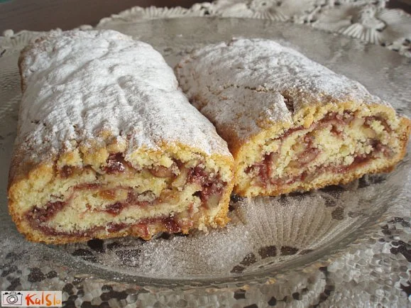 Testo pregnetemo in ga razdelimo na dva dela. Razvaljamo ga na kuhinjski krpi, namažemo z marmelado in posujemo z orehi. Zvijemo v rolado in spečemo na 190 stopinjah 35 minut. Ohlajeni roladi potresemo z mletim sladkorjem.