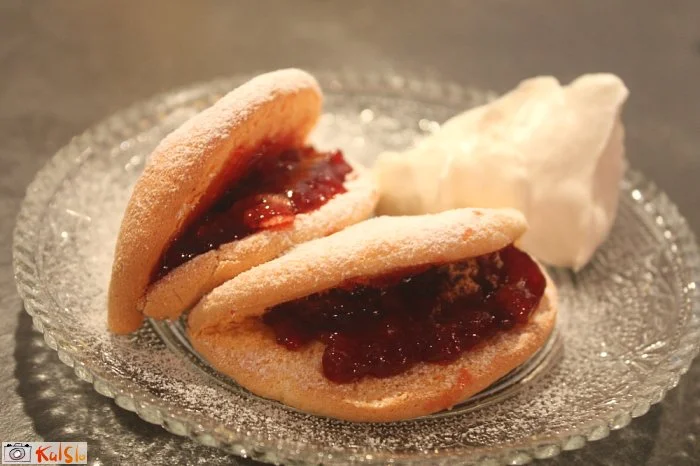 Namažemo v obliki kroga na peki papir, pekač damo na srednje vodilo v pečici in pečemo 10 minut. Vmes si pripravimo kompot oz. marmelado in stepemo smetano s sladkorjem.